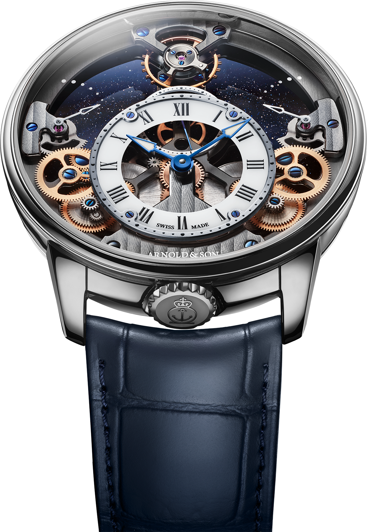 The expression ‘open-air’ applies literally here, as the glass used for the case-back offers yet another new interpretation by Arnold & Son. Neither transparent nor opaque, it is composed of an extremely thin disc of aventurine glass in what constitutes a first for this iconic material.