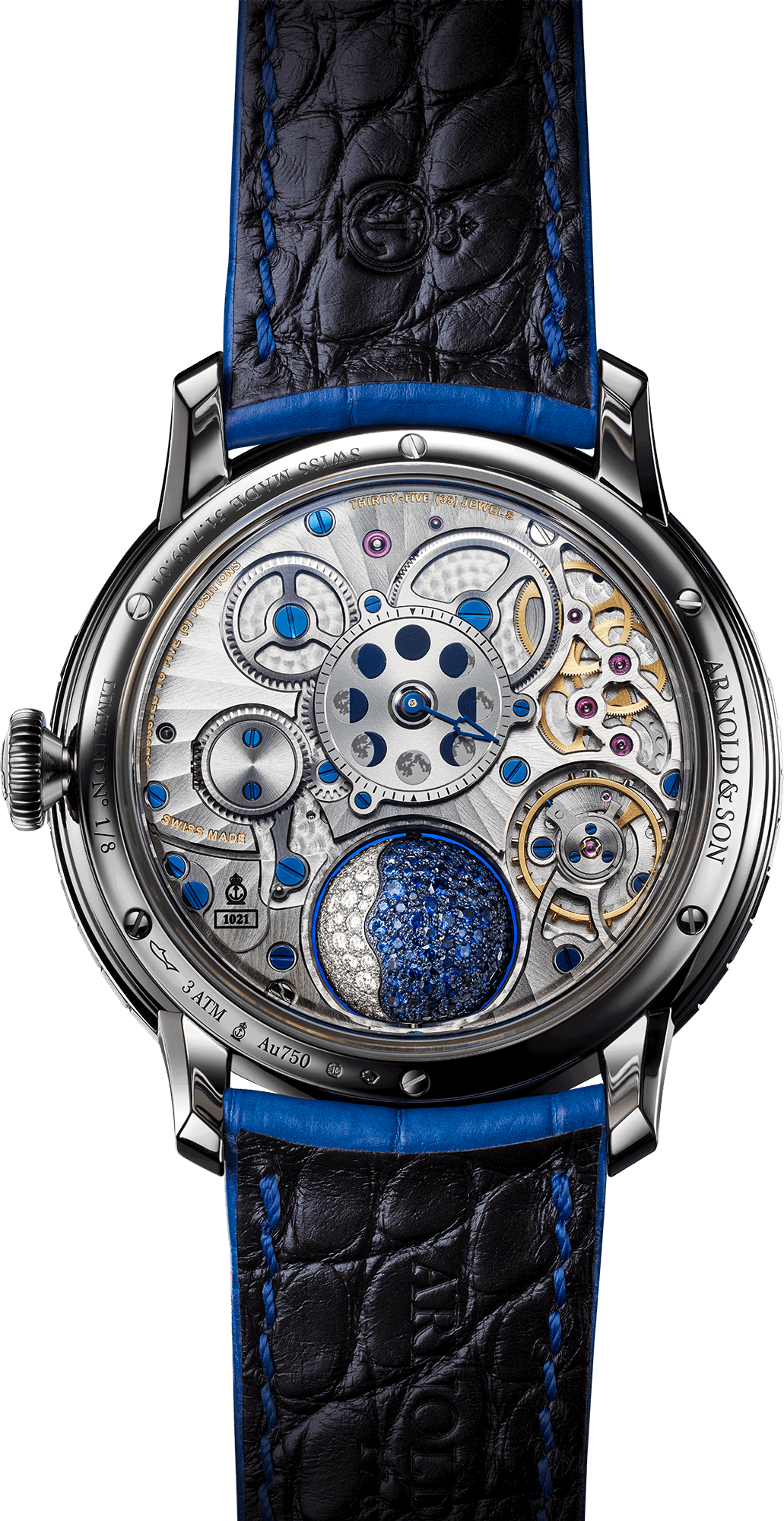 Luna Magna Ultimate II is driven by the A&S1021 calibre, which has been fully developed, manufactured, assembled and adjusted in the Manufacture. This hand-wound calibre, which has been designed with the lunar globe in mind, features a 90-hour power reserve and a regulating organ oscillating at a frequency of 3 Hz. The movement offers a secondary display on the case-back side presenting the phase of the moon. Its clearly readable markings are designed for high-precision adjustments. The sophisticated celestial mechanics are also based on precise astronomical reality. The duration of a complete lunar cycle is 29 days, 12 hours, 44 minutes and 2.8 seconds, and Arnold & Son has managed to replicate it in such a way that it will take 122 years for the movement’s display to deviate from the correct celestial reading by one day. The correction required at this time will be easy to make, as the Luna Magna’s moon-phase function is directly accessible from the crown. This practical feature has been made possible by Arnold & Son’s total command of the watchmaking process.