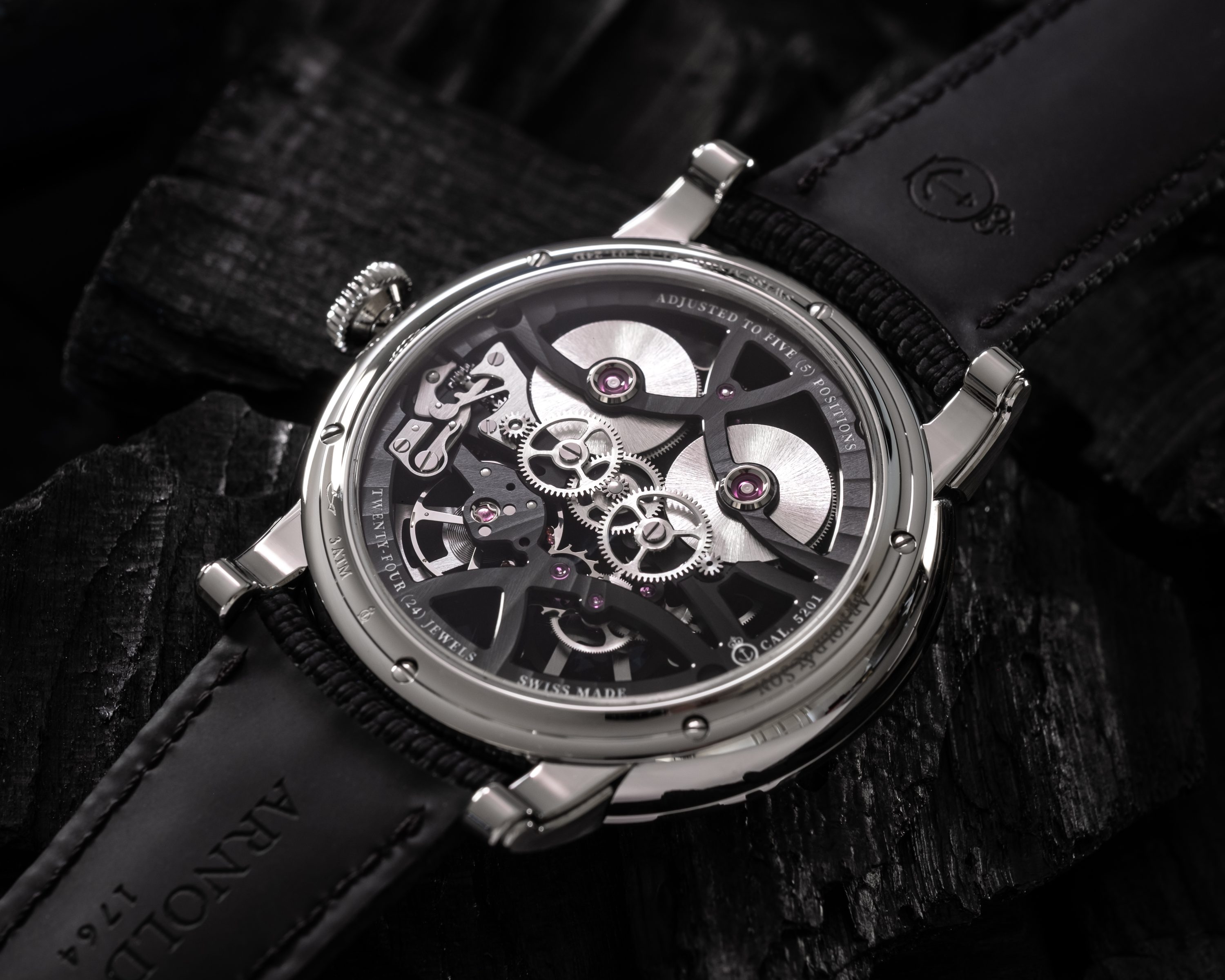 Viewed from the back, the A&S5201 calibre takes on another dimension. Two large arcs, also treated with DLC, intersect to reveal a second graphic structure, that of the main plate. Highly openworked, it, too, is chamfered and its surface is covered with a signature Arnold & Son pattern known as ‘Rayons de la Gloire’.
