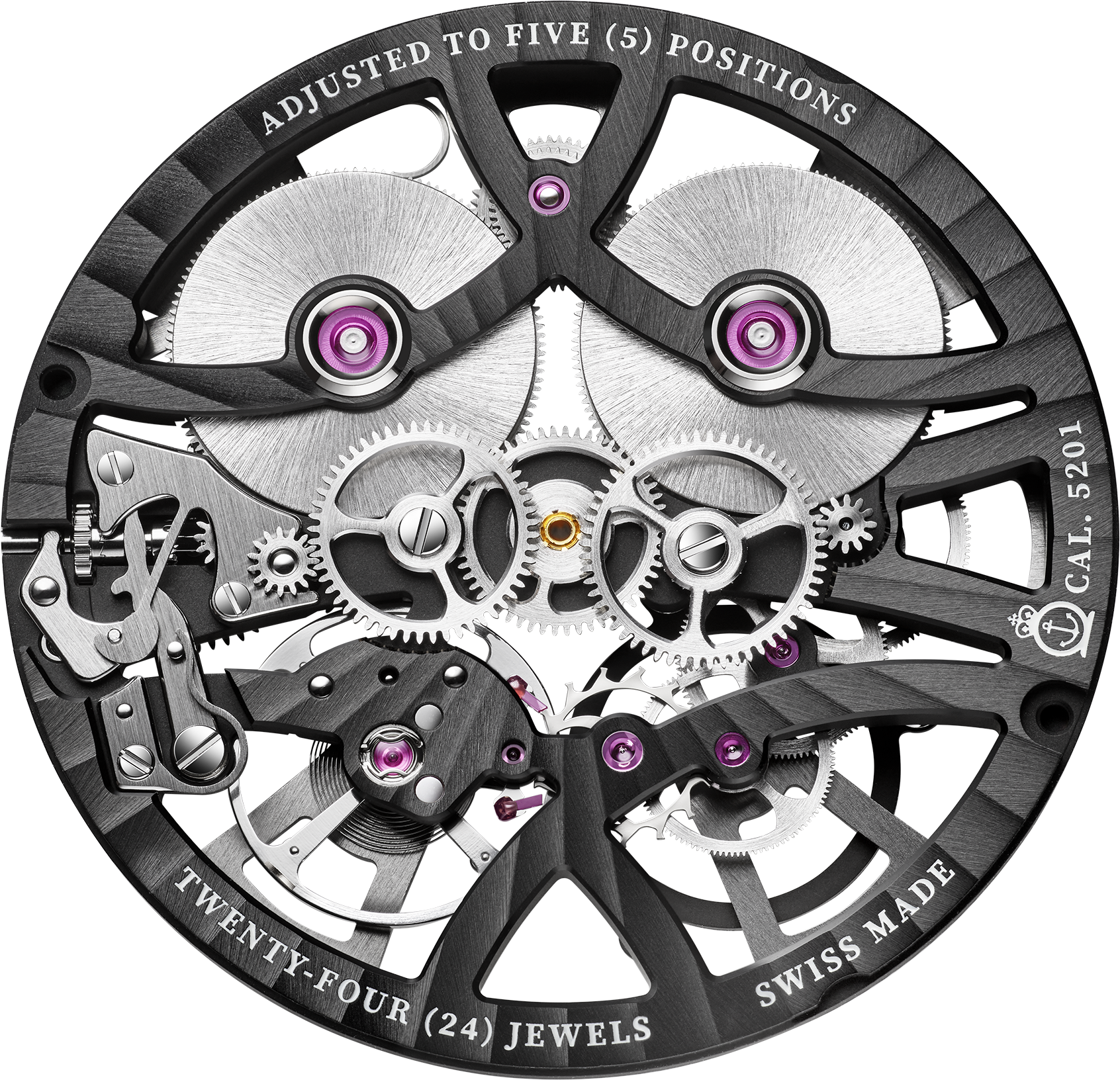 Like all the movements used by Arnold & Son, the A&S5201 calibre has been entirely developed, manufactured, decorated, assembled, adjusted and cased-up at the Manufacture in La Chaux-de-Fonds. This calibre draws on a pair of large barrels and an oscillating frequency of 3 Hz, which delivers a 90-hour power reserve. In addition, its depth of 4.18 mm is exceptional for a skeletonised movement, as these types of calibres usually retain a certain thickness in order to compensate for their openworked designs, which typically weaken their structures. Despite this, Arnold & Son’s long Manufacture experience has made it possible to imbue the Nebula’s mechanical latticework with extraordinary finesse.
